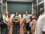 Die BGD-Reisegruppe (von links: Mechthild Black-Veltdrup, Anna Kohlmann, Andrea Nettebrock, Harriet Veldtrup) mit dem Generalvikar Father Dr. Davis George (2.v.l.), Bischof Dr. Valan Arasu (3.v.r.) und dem Bischofssekretär Father George Thomas (2.v.r.)